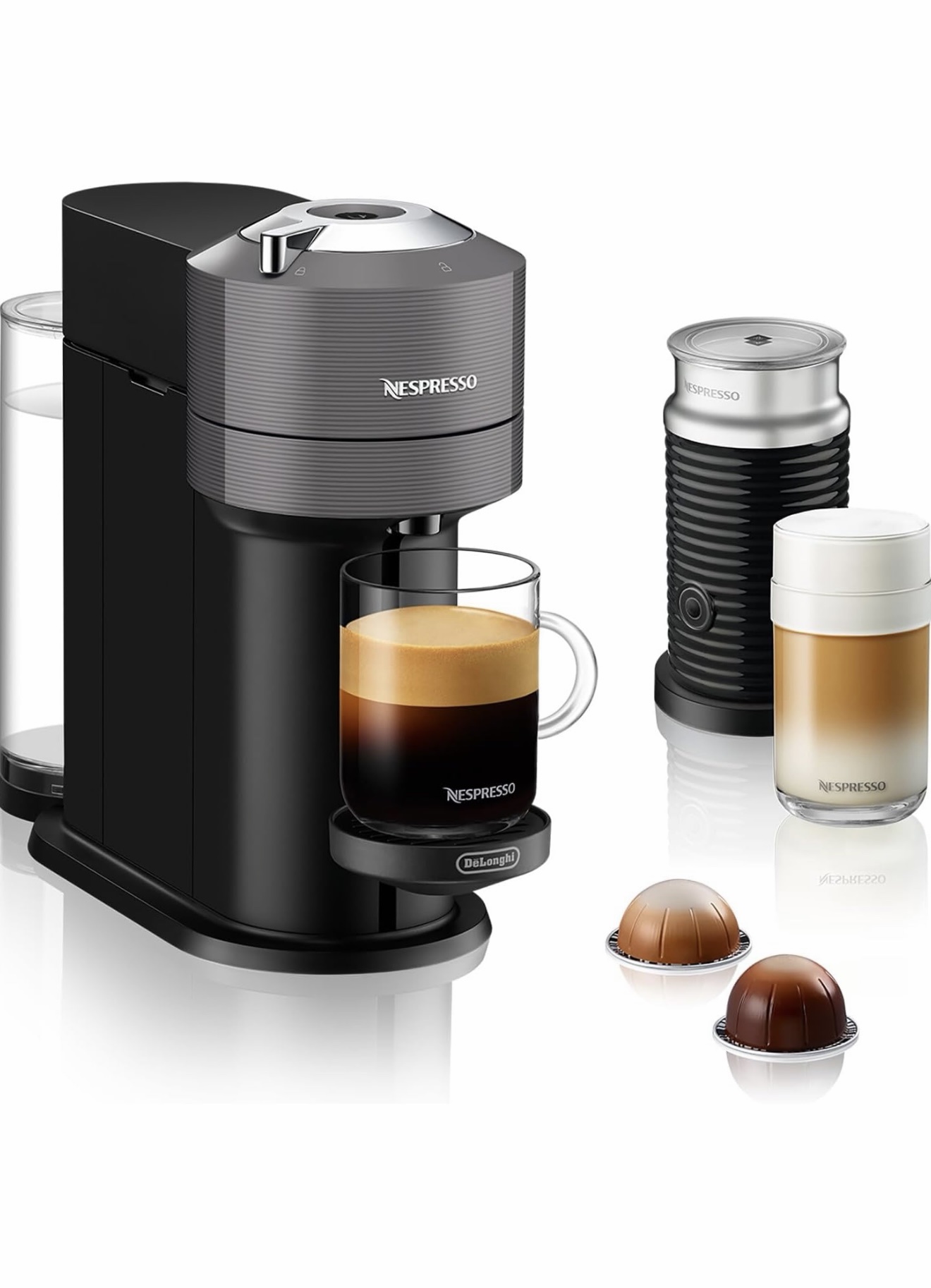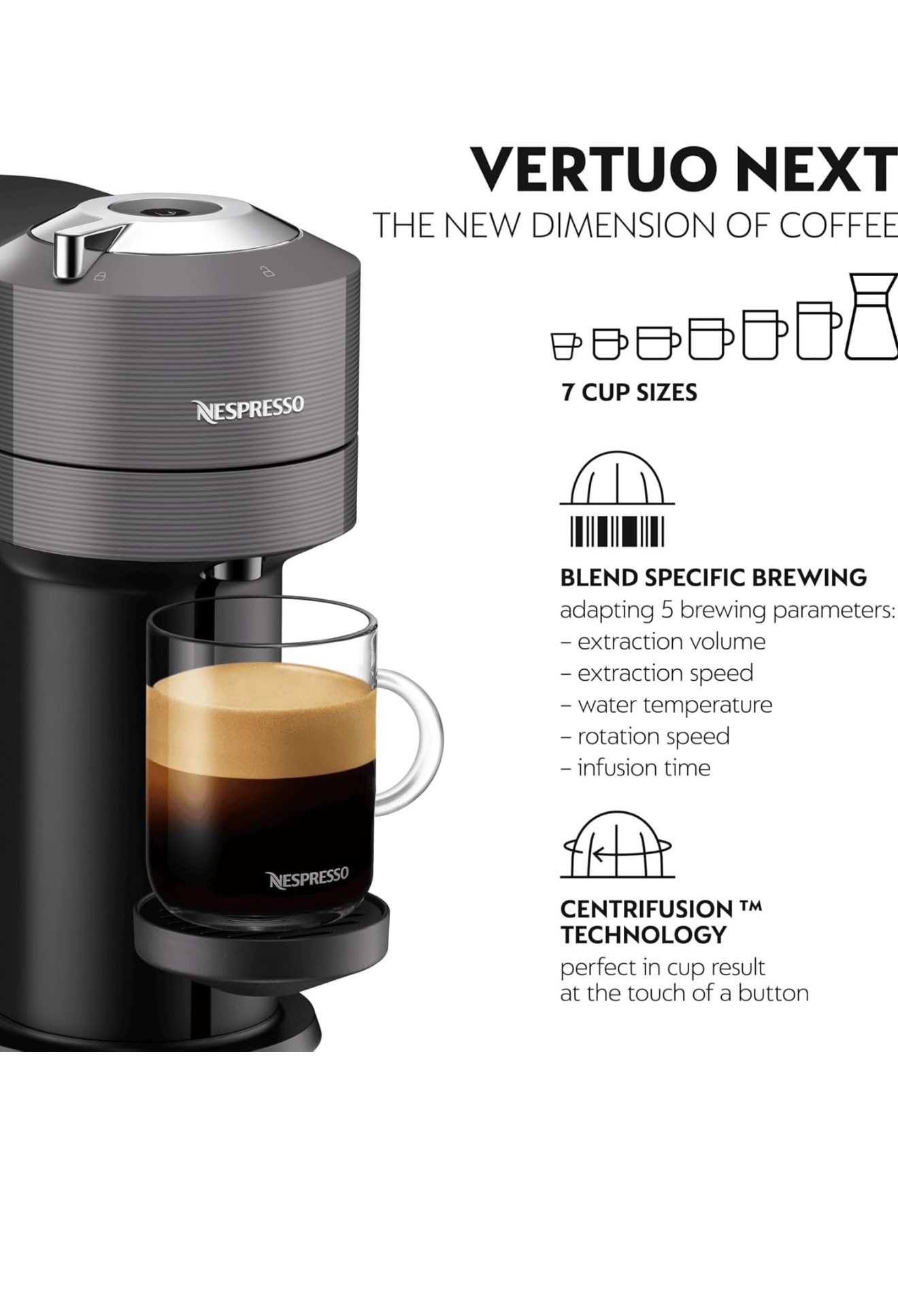 - INNOVATIVE TECHNOLOGY – Nespresso Vertuo Next coffee machine heats up in 30 seconds, integrated with the latest technology that reads the coffee pod’s barcode and automatically adjusts the brewing settings, Using a precise and customized amount of water, energy and coffee for each blend gives you the best possible cup, every time