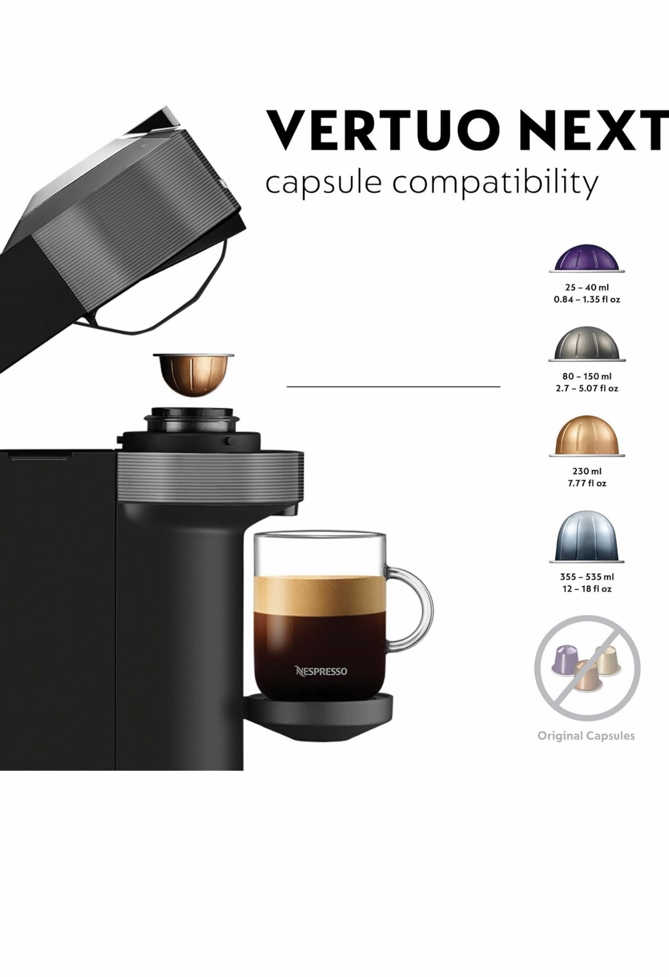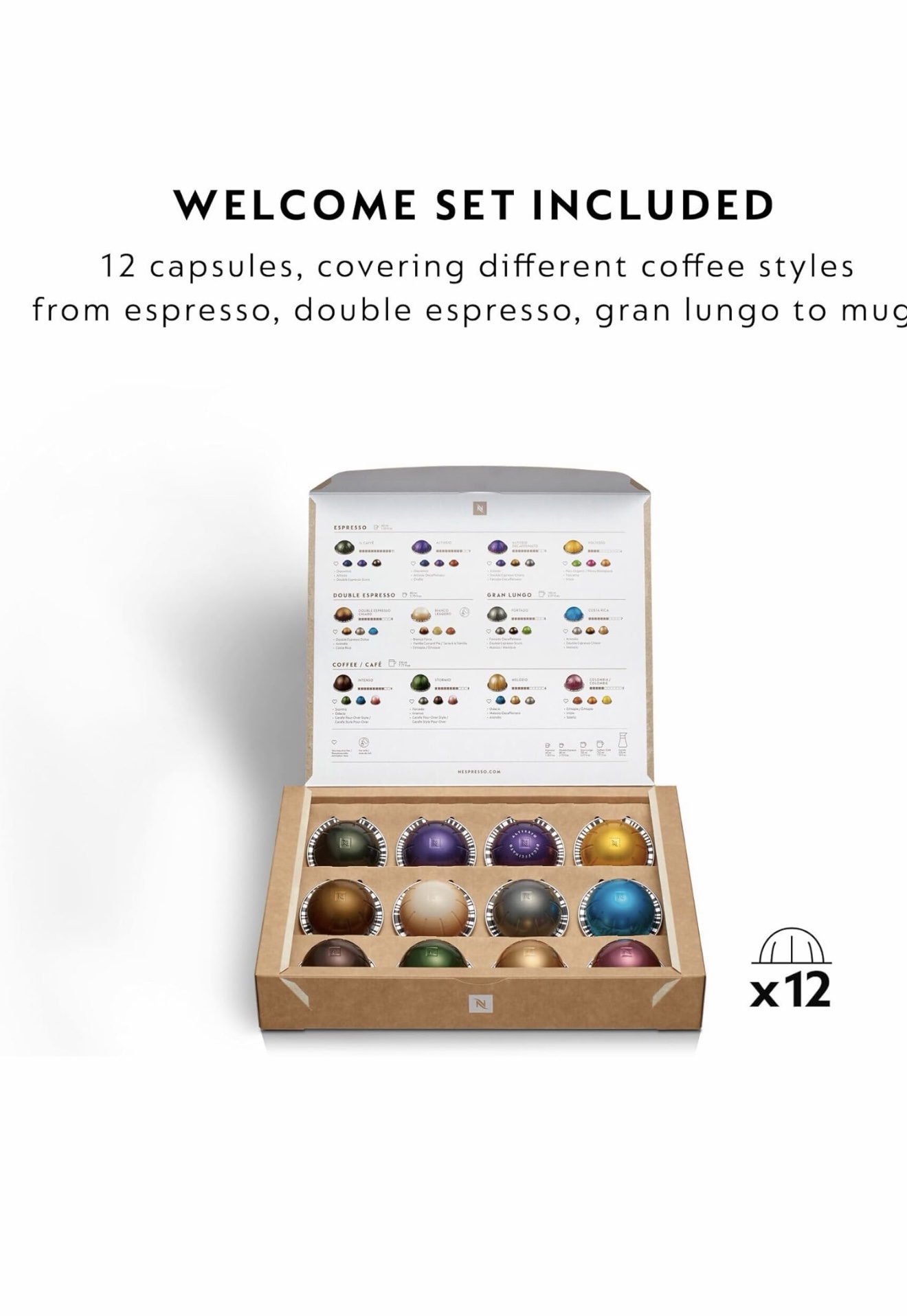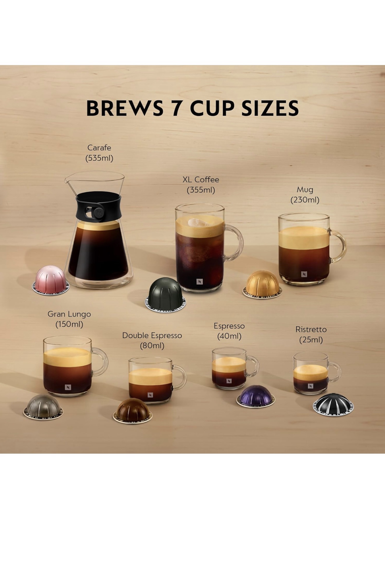 - VERSATILE COFFEE STYLES – From espressos, to iced or benefit-enhanced coffees, This Nespresso coffee machine brews 7 coffee cup sizes: Ristretto 25ml, espresso 40ml, double espresso 80ml, gran lungo Cup 150ml, Mug 230ml, Large mug 355ml and carafe 535ml, Includes complimentary welcome set of 12 pods