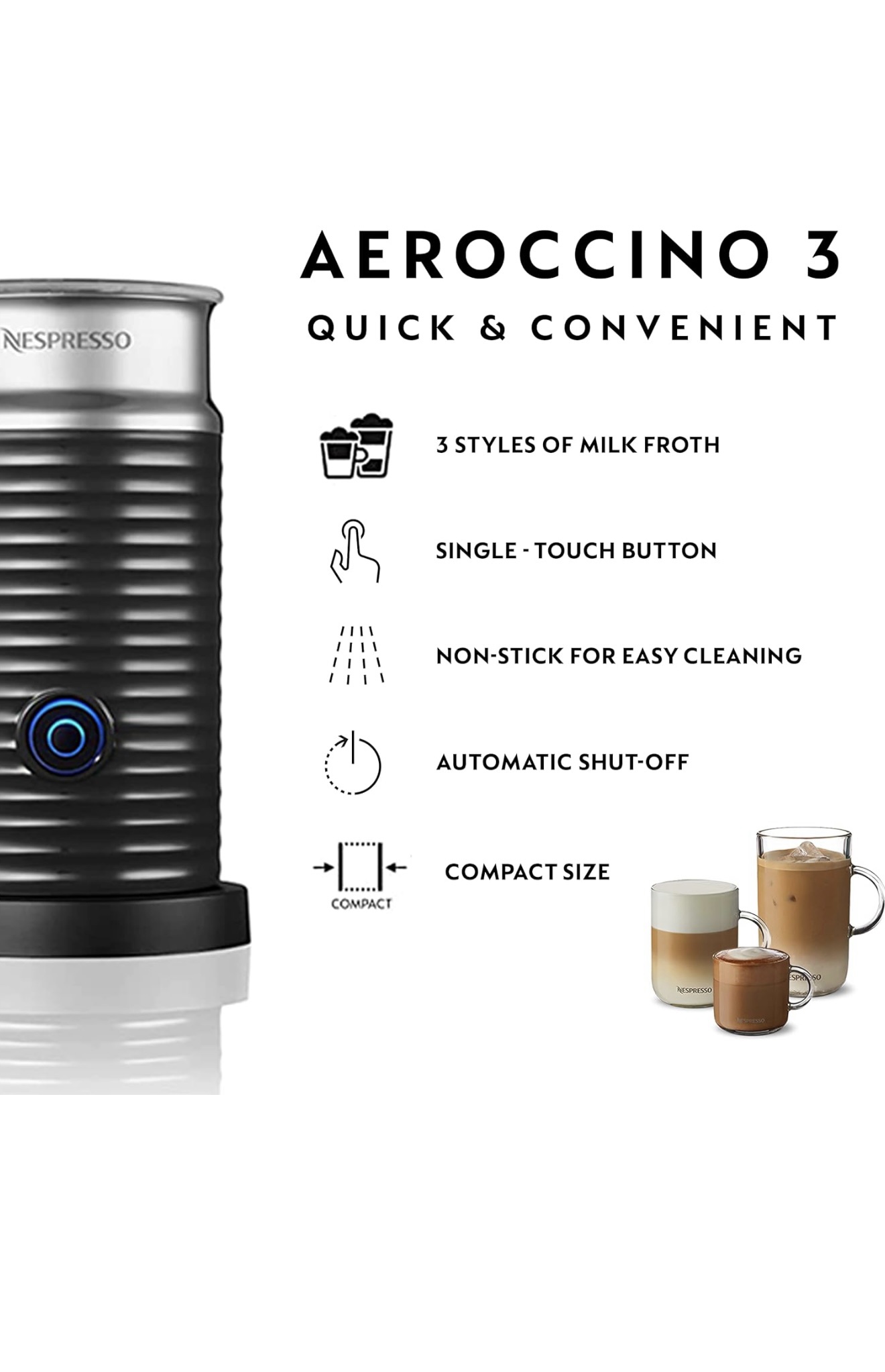 AEROCCINO: With the Nespresso Aeroccino3 milk frother, you have all your milk frothing dreams at the touch of a button; enjoy silky smooth milk foam that can be prepared either hot or cold
