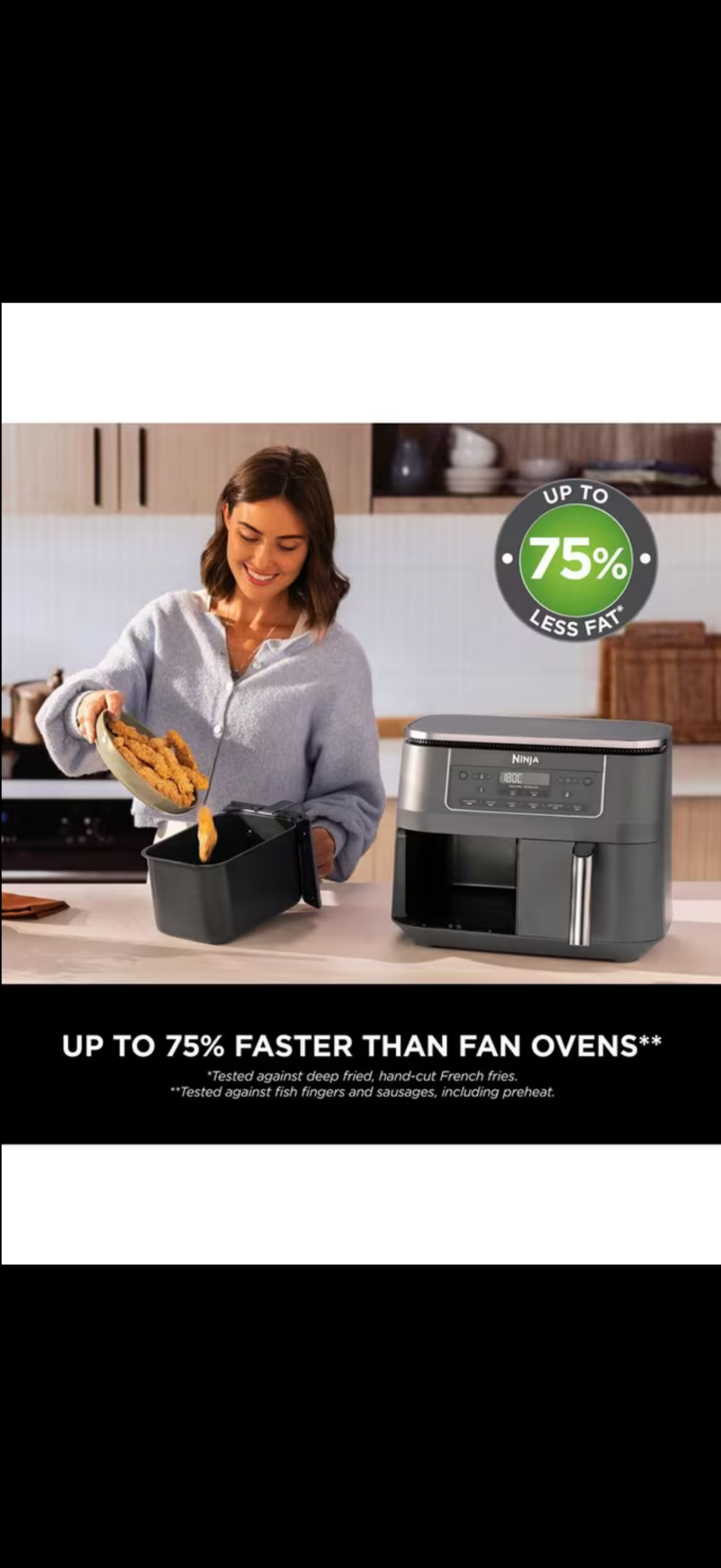 Quickly cook up to 75% faster than fan ovens**. Air Fry healthier versions of your favourite fried foods using little to no oil – up 75% less fat than traditional frying methods***.