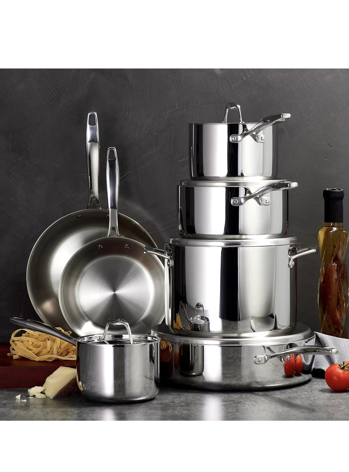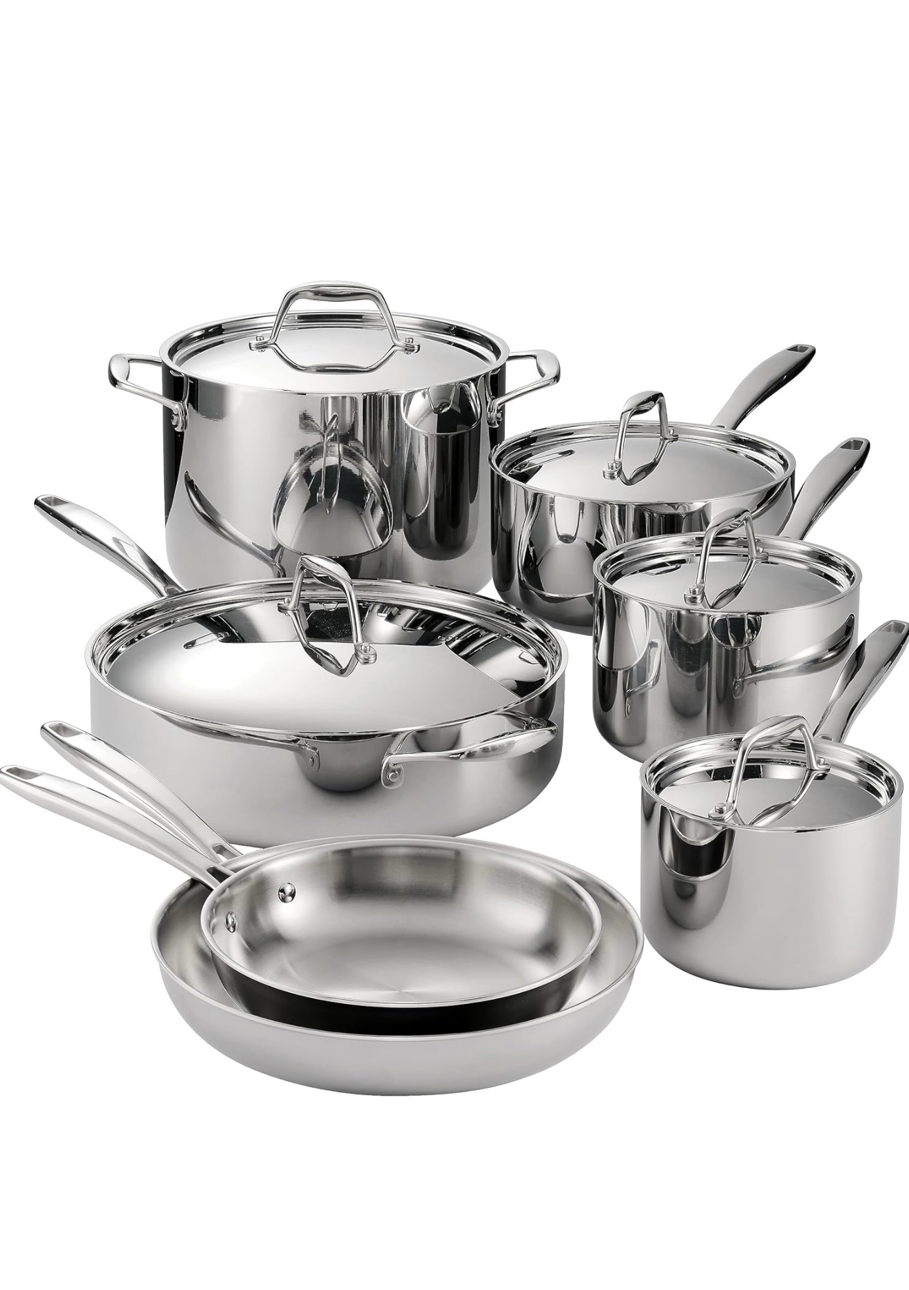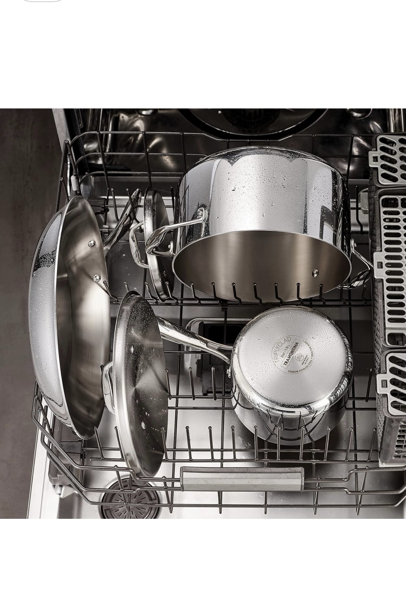 Tramontina’s 12-piece Tri-Ply Clad Stainless Steel Cookware Set is professional quality-cookware made for everyday use at home. Tri-Ply Clad features a layer of 18/10 stainless steel with a layer of magnetic stainless steel, with a layer of aluminum in between, that extends up the sides to the top of the pan. You’ll get all the pieces you need to prep your favorite oven and stovetop recipes, from stews and casseroles to sauces and scrambles, faster and more evenly.